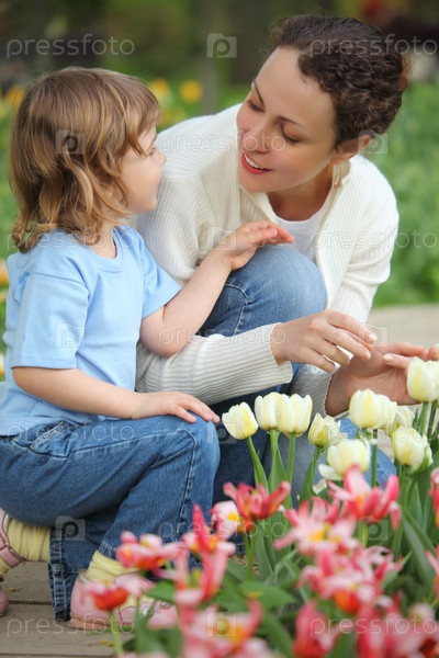 Девочка вместе с мамой сидят у клумбы с тюльпанами