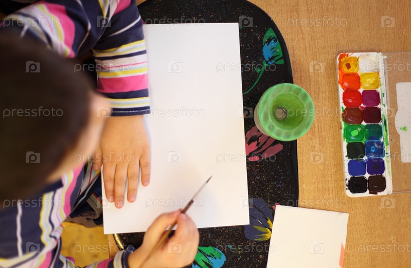 Мальчик рисует красками на бумаге