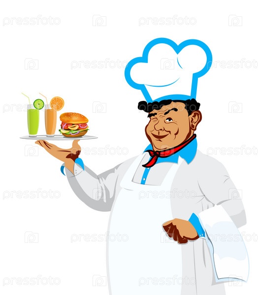 Шеф-повар с гамбургером и фруктовыми соками на подносе на белом фоне