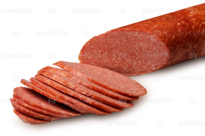 Нарезанная колбаса на белом фоне