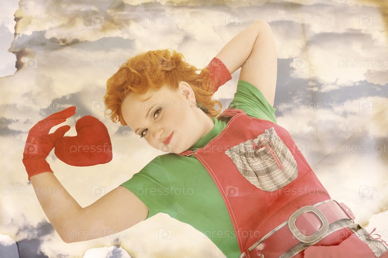 Красивая девушка, лежащие у игрушечного сердца в облаках