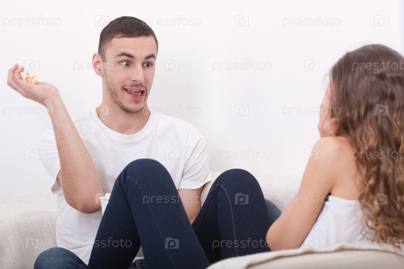 Молодой человек бросает попкорн в подругу