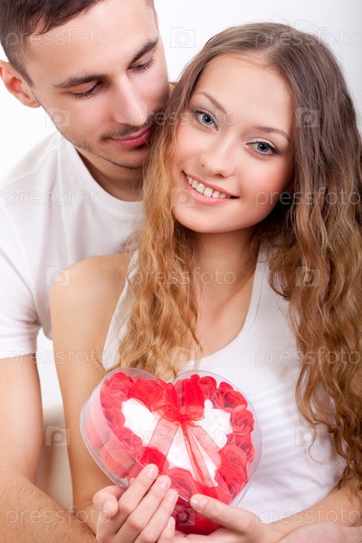 Мужчина дарит конфеты своей подруге