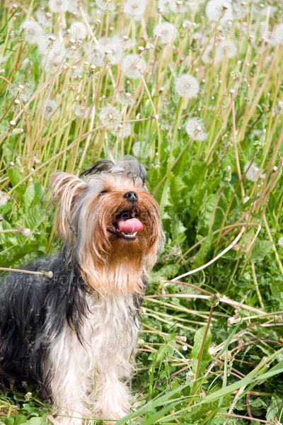 Йоркширский терьер среди одуванчиков