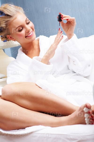 Портрет счастливой женщины в белом халате, полирующей ногти красной лакой
