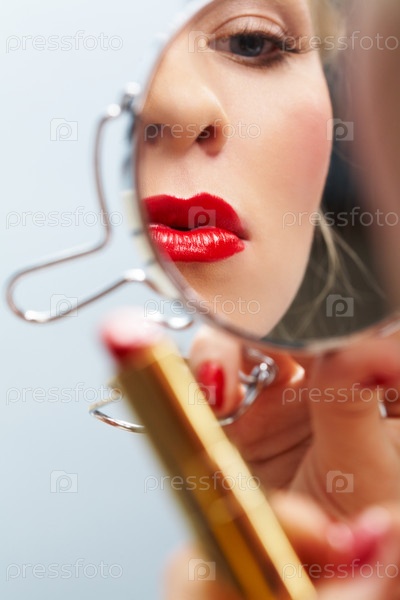 Женщина смотрит в зеркало и красит губы