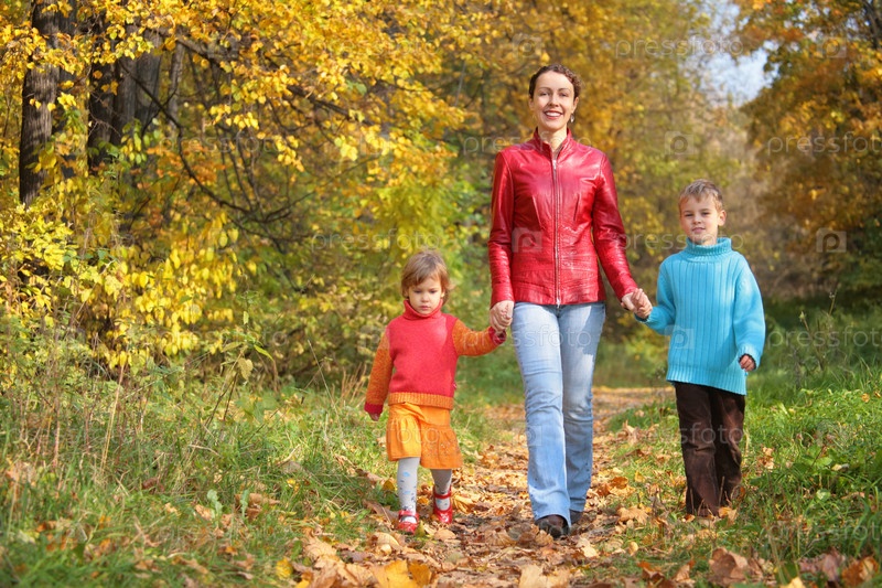 Мама с детьми гуляет в лесу