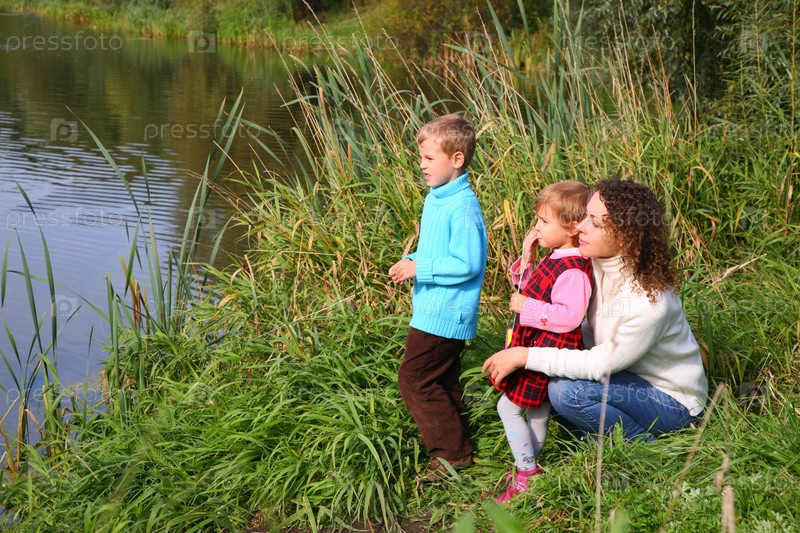 Мама с детьми на берегу озера