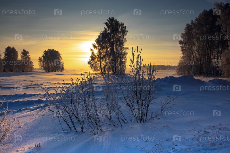 Снежное поле с деревьями в лучах заходящего солнца