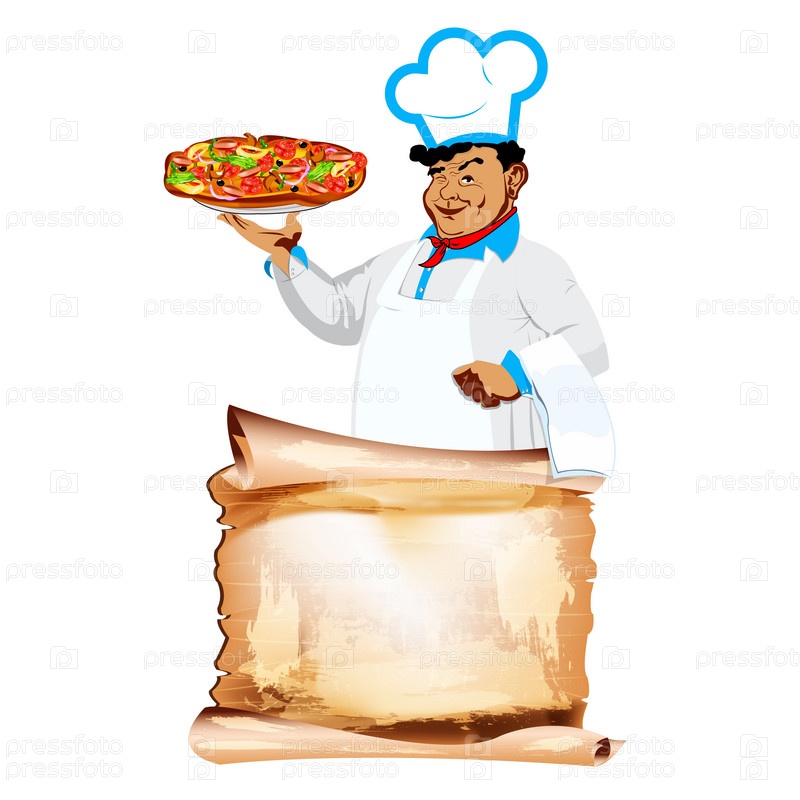Мужчина шеф-повар с традиционной итальянской пиццей и меню ресторана на белом фоне