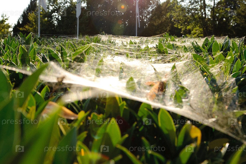 Паутина на листьях в городском парке