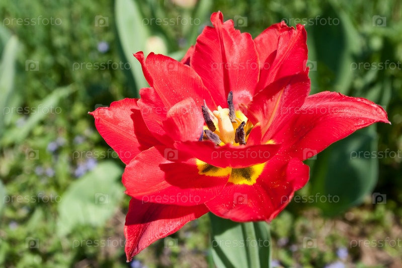 Махровый красный тюльпан на фоне садовой зелени