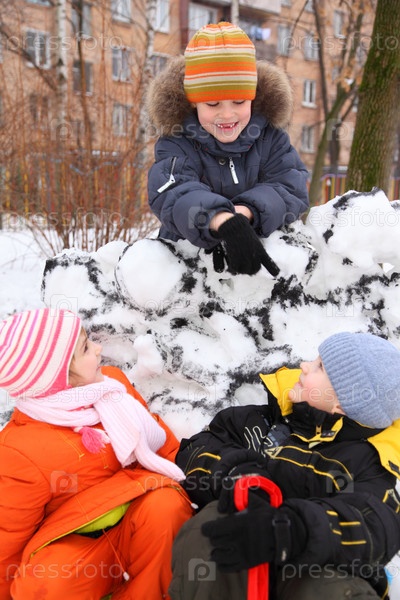 Трое детей на снежной крепости во дворе