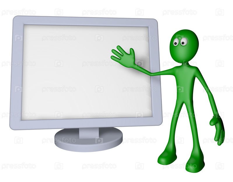 Зеленый человечек и плоский монитор - 3d иллюстрация