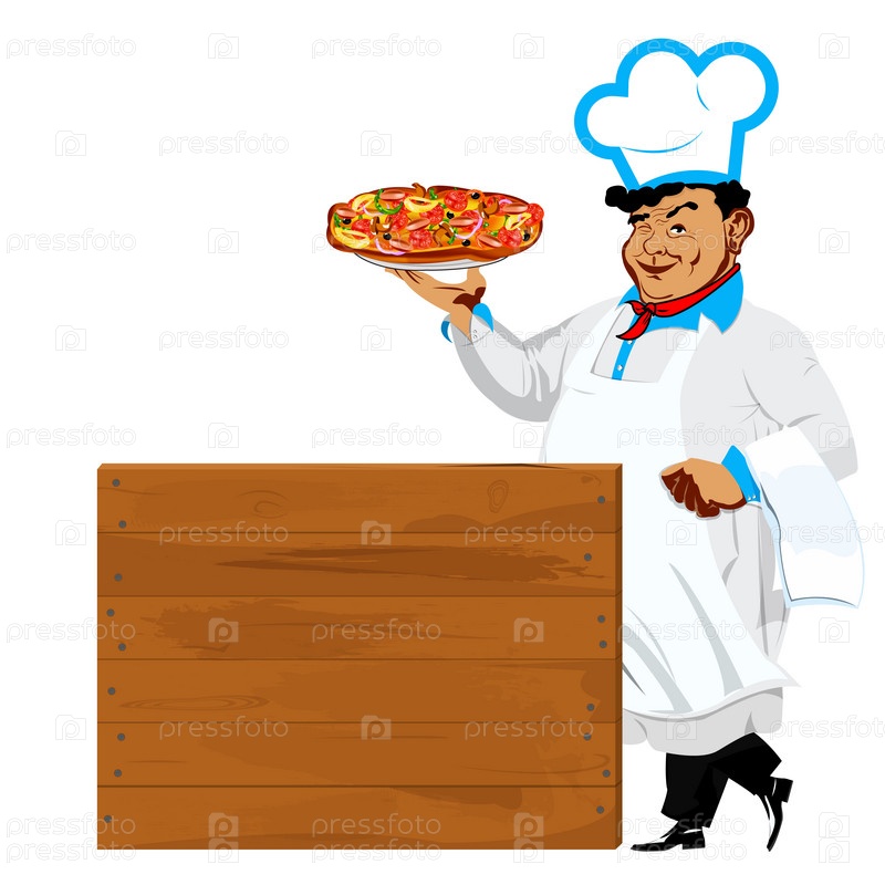 Мужчина шеф-повар с традиционной итальянской пиццей и деревянное меню пиццерии на белом фоне