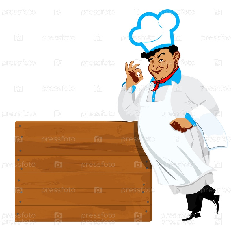 Мужчина шеф-повар и деревянное меню кафе на белом фоне