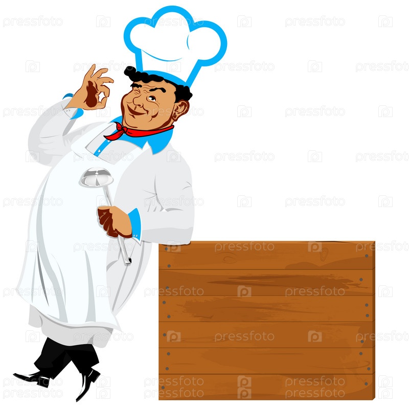 Мужчина шеф-повар с половником и деревянное меню ресторана на белом фоне