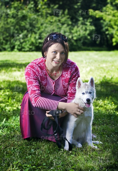 Молодая женщина со щенком породы сибирский хаски