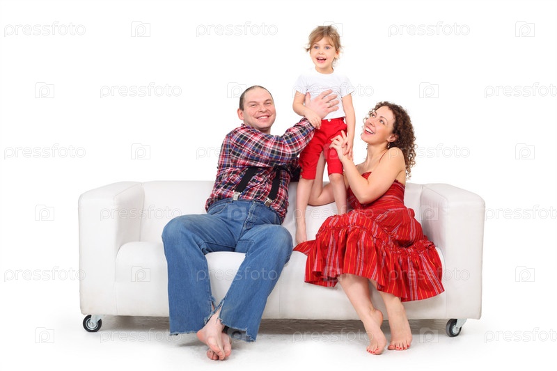 Родители с дочерью на белом кожаном диване
