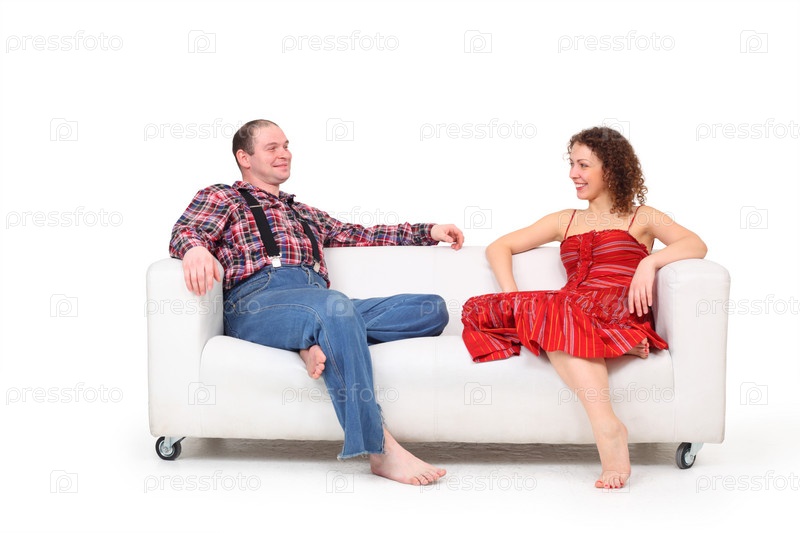 Босые мужчина и женщина сидят на белом кожаном диване