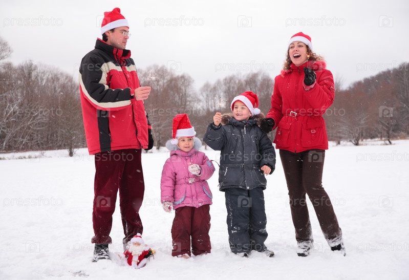 Отец и мать с детьми жгут бенгальские огни в парке зимой