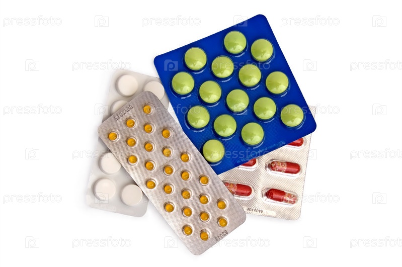 Капсулы и таблетки в упаковках на белом фоне