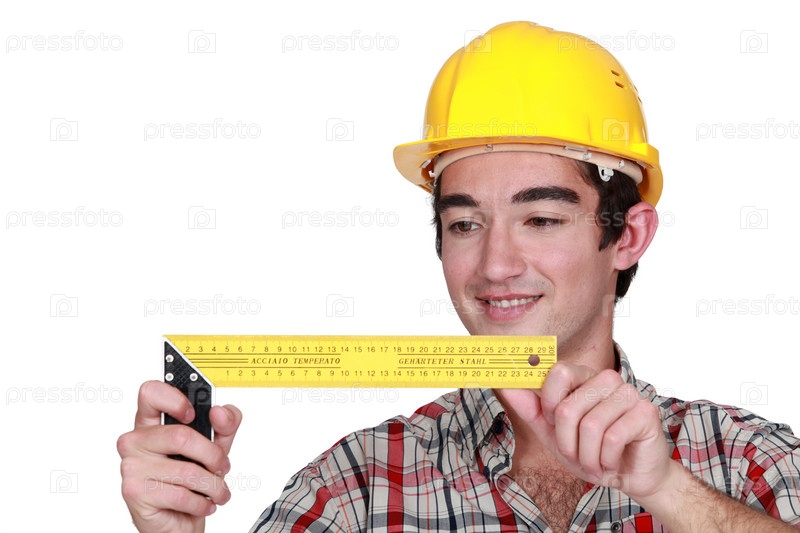 Молодой строитель держит угольник