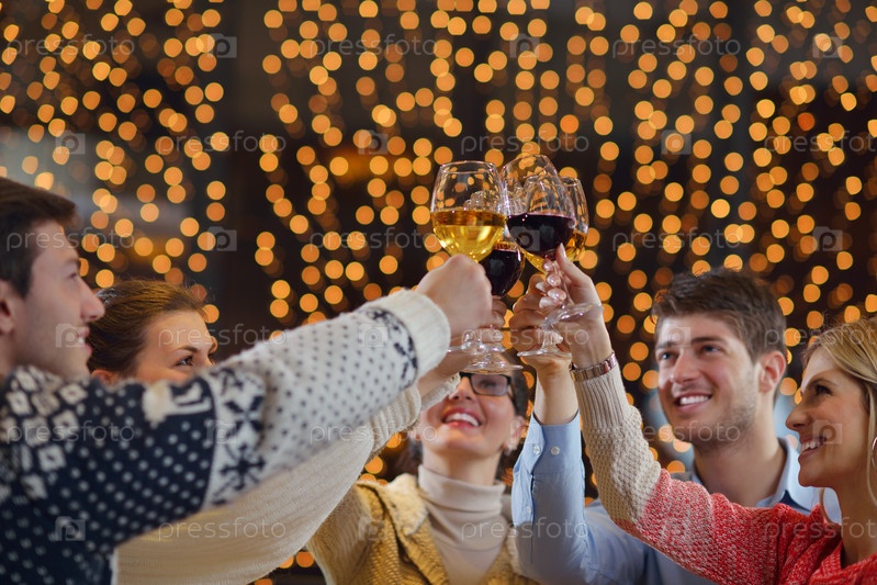 Группа счастливых молодых людей пьет вина на вечеринке