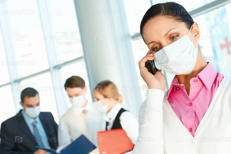 Привлекательная бизнес-леди на фоне коллег в медицинских масках