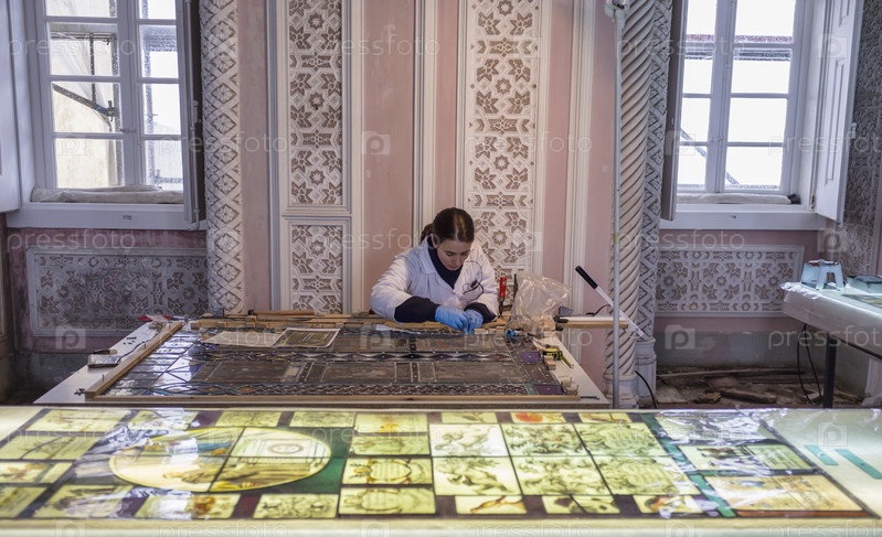 Португалия, Синтре, дворец Пена, реставратор работает над оригинальным мозаичным стеклом