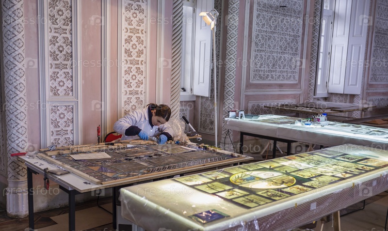 Португалия, Синтре, дворец Пена, реставратор работает над оригинальным мозаичным стеклом