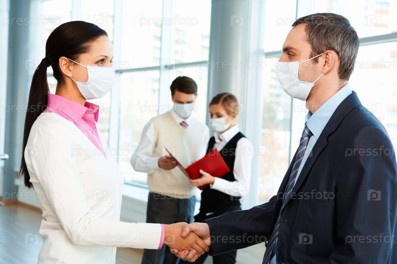 Крепкое рукопожатие партнеров в медицинских масках
