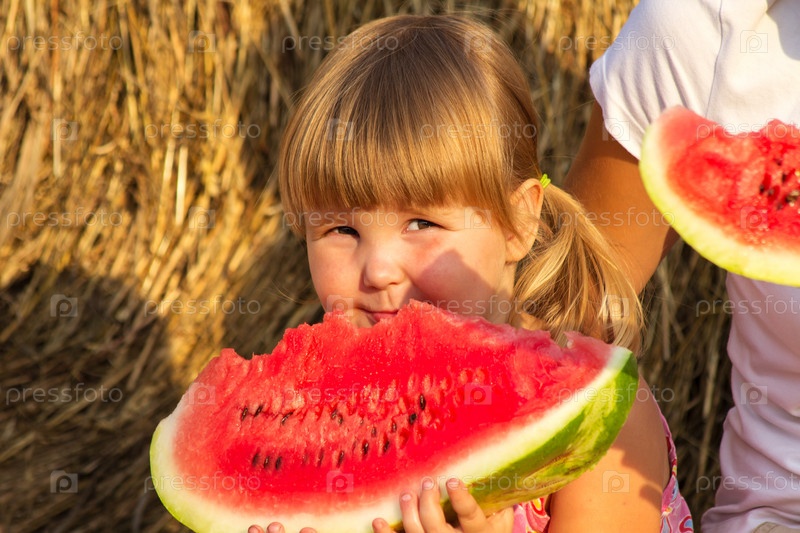 Девочка ест красный вкусный арбуз