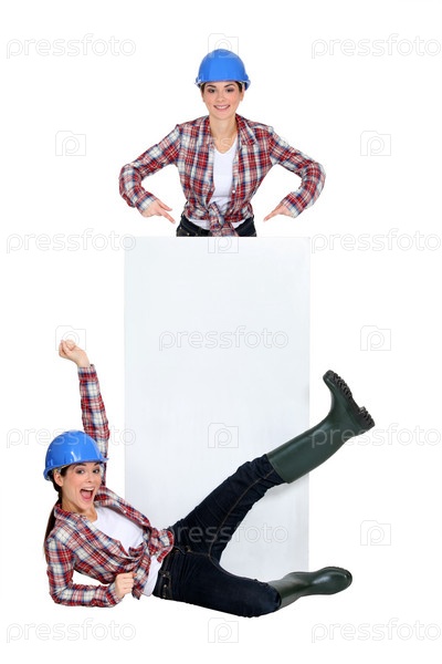 Строители с рекламным щитом