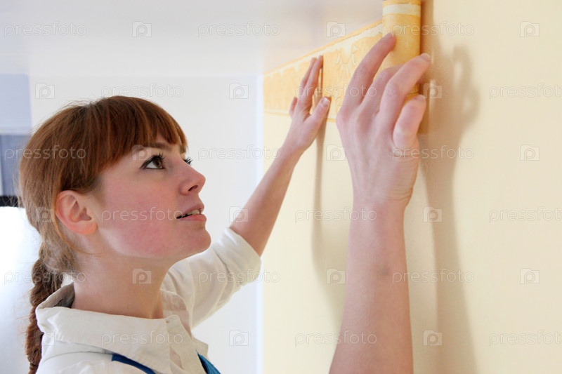 Женщина клеит обои в комнате