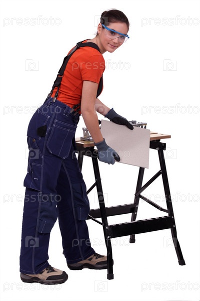 Женщина режет плитку