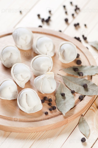 Сырые пельмени, лавровый лист и перец