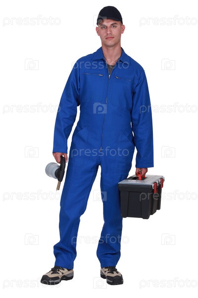 Рабочий держит сварочный аппарат и ящик для инструментов