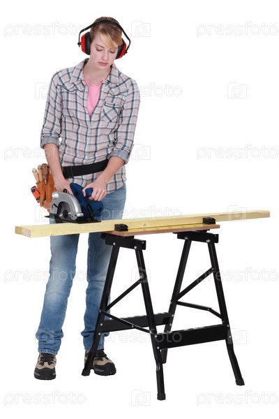 Женщина с циркулярной пилой отрезает деревянные доски