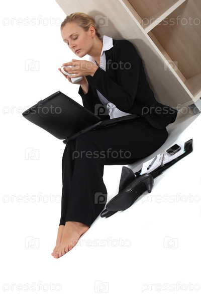 Босая бизнес-леди сидит у стола и пьет кофе