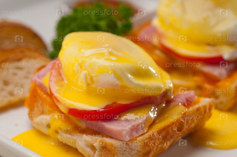 Яйца бенедикт на хлебе с помидорами и ветчиной