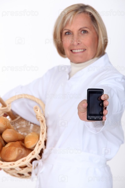 Пекарь держит мобильный телефон и корзину багетов