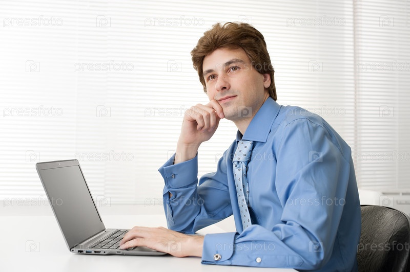 Задумчивый деловой человек с ноутбуком
