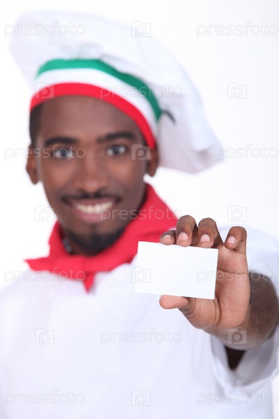 Молодой темнокожий итальянский повар показывает визитную карточку