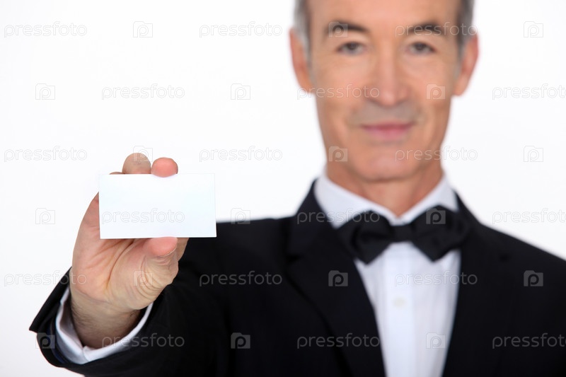 Седой официант показывает визитную карточку