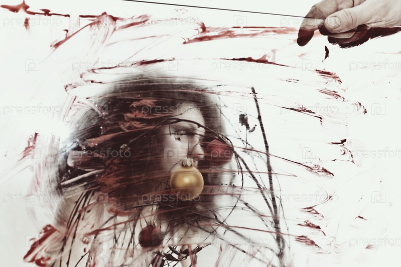 Молодая кудрявая женщина в белом платье на грязном стекле