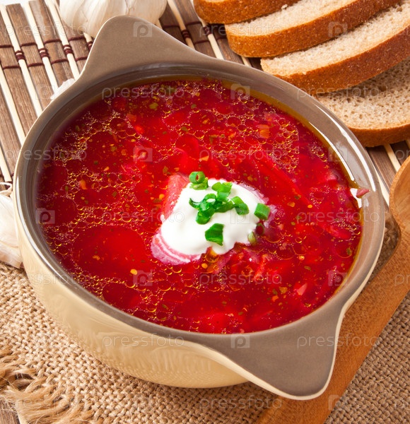 Украинский и русский национальный красный суп борщ крупным планом