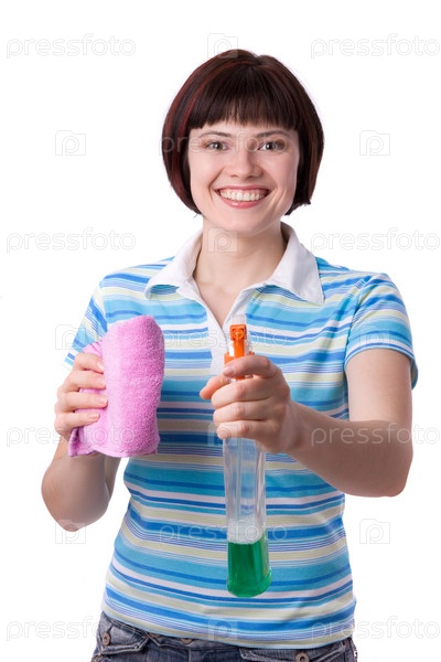 Женщина с чистящим средством для стекол и тряпкой