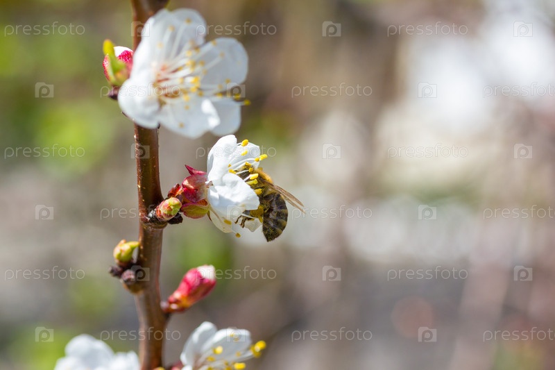 Пчела на цветущем вишневом дереве