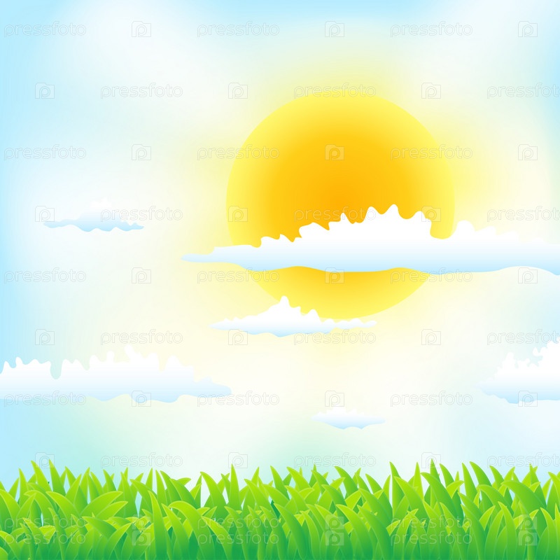 Весенний фон с травой, солнцем и облаками